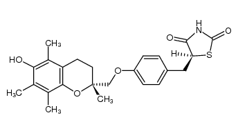 METABOLISM ANTIDIABETIC HYPOGLYCEMIC AGENTS PPAR AGONIST | ORAL | Cmax 6.39 MICROMOLAR (600 MILLIGRAM) VD 1202 LITER (65 KILOGRAM) PPB 99 PERCENT Cl 29.7 LITER / HOUR HT 25 HOUR SOLUBILITY PRATICALLY INSOLUBLE IN WATER | PEROXISOME PROLIFERATOR-ACTIVATED RECEPTOR GAMMA (PPAR) PDB 6DGO (CRYSTAL STRUCTURE OF HUMAN PPARGAMMA LIGAND BINDING DOMAIN IN COMPLEX WITH TROGLITAZONE) LIGAND CODE = GD4 (link to the list of PDB complexes) Download experimental 3D coordinates of GD4 with added hydrogens | Peroxisome proliferator-activated receptor gamma UNIPROT P37231 PPARG more at DrugCentral | EMA ANSM (in French) Inxight Drugs Dailymed Drugs.com VigiAccess SIDER side effects Chemical Probes Portal ChEMBL BindingDB DrugBank |