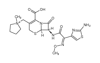 ANTIINFECTIVES ANTIBIOTIC ANTIBACTERIAL CEPHALOSPORINS | INJECTION INTRAVENOUS | Cmax 340.7 MICROMOLAR F 82 PERCENT (IM) VD 18 LITER PPB 20 PERCENT Cl 7.2 LITER / HOUR HT 2 HOUR SOLUBILITY HIGHLY SOLUBLE IN WATER | PENICILLIN-BINDING PROTEIN PDB 5OJ0 (PENICILLIN-BINDING PROTEIN 2X (PBP2X) FROM STREPTOCOCCUS PNEUMONIAE IN COMPLEX WITH CEFEPIME) LIGAND CODE = 9WT (link to the list of PDB complexes) Download experimental 3D coordinates of 9WT with added hydrogens | Bacterial penicillin-binding protein UNIPROT P02918 mrcA more at DrugCentral | EMA ANSM (in French) Inxight Drugs Dailymed Drugs.com VigiAccess SIDER side effects Chemical Probes Portal ChEMBL BindingDB DrugBank |