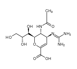 ANTIINFECTIVES ANTIVIRAL ANTIINFLUENZA NEURAMINIDASE INHIBITOR | INHALATION | Cmax 427.7 NANOMOLAR Tmax 1.5 HOUR F 10.5 PERCENT VD 14.9 LITER (65 KILOGRAM) PPB 10 PERCENT Cl 6.7 LITER / HOUR HT 3.8 HOUR SOLUBILITY 18 MILLIGRAM / MILLILITER IN WATER | NEURAMINIDASE PDB 3TIC (CRYSTAL STRUCTURE OF 1957 PANDEMIC H2N2 NEURAMINIDASE COMPLEXED WITH ZANAMIVIR) LIGAND CODE = ZMR (link to the list of PDB complexes) Download experimental 3D coordinates of ZMR with added hydrogens | Neuraminidase UNIPROT P03468 -- Neuraminidase UNIPROT P03474 more at DrugCentral | EMA ANSM (in French) Inxight Drugs Dailymed Drugs.com VigiAccess SIDER side effects Chemical Probes Portal ChEMBL BindingDB DrugBank |