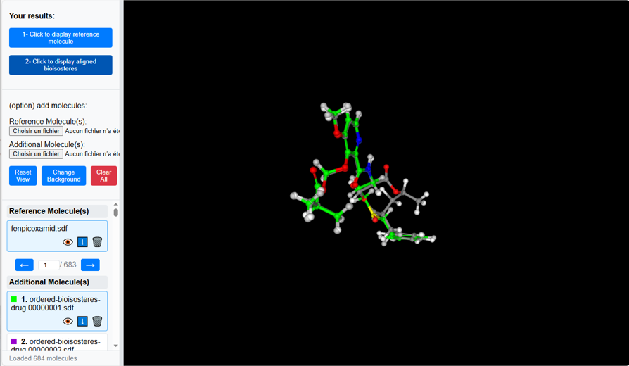 Download best aligned bioisosteres ordered-bioisosteres-drug.sdf (683) and scores ordered-bioisosteres-drug-score.txt (more information on scores).To visualize superimposition results: 3Dviewer