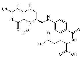 VARIOUS ANTIANEMIC ANTIDOTE TO FOLIC ACID ANTAGONISTS ANTINEOPLASTIC ADJUNCTS RESCUE AFTER HIGH-DOSE METHOTREXATE THERAPY IN OSTEOSARCOMA USE IN COMBINATION CHEMOTHERAPY WITH 5-FLUOROURACIL RAPIDLY ABSORBED AND ENTERS THE GENERAL BODY POOL OF REDUCED FOLATES CONVERTED TO 5-METHYLTETRAHYDROFOLIC ACID (5-METHYL-THF) | INTRAMUSCULAR INTRAVENOUS INJECTION ORAL | VD 16.2 LITER (65 KILOGRAM) PPB 91 PERCENT Cl 22.6 LITER / HOUR (65 KILOGRAM) HT 1.3 HOUR SOLUBILITY SOLUBLE IN WATER | PDB 4LXX (CRYSTAL STRUCTURE WLARD, A SUGAR 3N-FORMYL TRANSFERASE IN THE PRESENCE OF DTDP-FUC3NFO AND 5-N-FORMYL-THF) LIGAND CODE = FON (link to the list of PDB complexes) Download experimental 3D coordinates of FON with added hydrogens | Thymidylate synthase UNIPROT P04818 TYMS -- Dihydrofolate reductase UNIPROT P00374 DHFR more at DrugCentral | EMA ANSM (in French) Inxight Drugs Dailymed Drugs.com VigiAccess SIDER side effects Chemical Probes Portal ChEMBL BindingDB DrugBank |