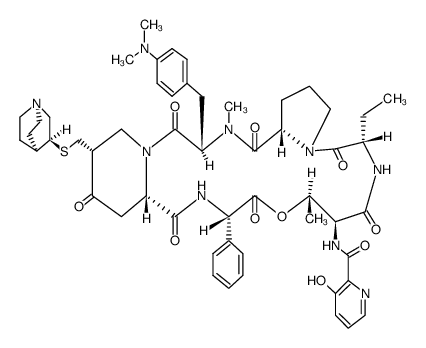 ANTIINFECTIVES ANTIBIOTIC ANTIBACTERIAL STREPTOGRAMINS BACTERIAL RIBOSOME (INHIBITS THE LATE PHASE OF PROTEIN SYNTHESIS) | INJECTION INTRAVENOUS | Cmax 3.1 MICROMOLAR VD 29 LITER (65 KILOGRAM) PPB 66 PERCENT Cl 46.8 LITER / HOUR (65 KILOGRAM) HT 0.85 HOUR | RIBOSOME STAPHYLOCOCCUS AUREUS VIRGINIAMYCIN B LYASE PDB 2Z2P (CATALYTICALLY INACTIVE H270A VIRGINIAMYCIN B LYASE FROM STAPHYLOCOCCUS AUREUS) | Unknown more at DrugCentral | EMA ANSM (in French) Inxight Drugs Dailymed Drugs.com VigiAccess SIDER side effects Chemical Probes Portal ChEMBL BindingDB DrugBank |