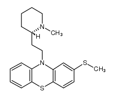 NERVOUS SYSTEM ANTIPSYCHOTIC MANAGEMENT OF SCHIZOPHRENIC PATIENTS ANXIOLYTIC DOPAMINE ANTAGONISTS PHENOTHIAZINES | ORAL | Cmax 0.55 MICROMOLAR HT 15 HOUR | DOPAMINE RECEPTOR 5-HYDROXYTRYPTAMINE 2A RECEPTOR ALPHA-1A ADRENERGIC RECEPTOR PDB 4I1R (HUMAN MALT1 (CASPASE-IG3) IN COMPLEX WITH THIORIDAZINE) LIGAND CODE = LZU (link to the list of PDB complexes) Download experimental 3D coordinates of LZU with added hydrogens | D(2) dopamine receptor UNIPROT P14416 DRD2 more at DrugCentral | EMA ANSM (in French) Inxight Drugs Dailymed Drugs.com VigiAccess SIDER side effects Chemical Probes Portal ChEMBL BindingDB DrugBank |