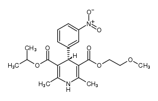 CARDIOVASCULAR VASODILATOR CALCIUM CHANNEL ANTAGONIST ANTIHYPERTENSIVE AGENTS | ORAL | Tmax 1 HOUR F 13 PERCENT VD 66 LITER PPB 95 PERCENT Cl 54 LITER / HOUR HT 1.5 HOUR SOLUBILITY PRACTICALLY INSOLUBLE IN WATER | CALCIUM CHANNEL | Voltage-dependent L-type calcium channel subunit alpha-1C UNIPROT Q13936 CACNA1C -- Voltage-dependent L-type calcium channel subunit alpha-1D UNIPROT Q01668 CACNA1D more at DrugCentral | EMA ANSM (in French) Inxight Drugs Dailymed Drugs.com VigiAccess SIDER side effects Chemical Probes Portal ChEMBL BindingDB DrugBank |