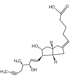 BLOOD ANTIHYPERTENSIVE ANALOG OF PROSTACYLIN INDICATED FOR THE TREATMENT OF PULMONARY ARTERIAL HYPERTENSION (PAH) | INHALATION INTRAVENOUS | Cmax NOT DETECTABLE (PICOMOLAR) VD 24 LITER (65 KILOGRAM) PPB 60 PERCENT Cl 62 LITER / HOUR (65 KILOGRAM) HT 0.57 HOUR SOLUBILITY VERY SLIGHTLY SOLUBLE IN DISTILLED WATER BUFFER PH 5 | PROSTACYCLIN RECEPTOR PGI2 PDB 3SP6 (STRUCTURAL BASIS FOR ILOPROST AS A DUAL PPARALPHA, DELTA AGONIST) LIGAND CODE = IL2 (link to the list of PDB complexes) Download experimental 3D coordinates of IL2 with added hydrogens | Prostacyclin receptor UNIPROT P43119 PTGIR more at DrugCentral | EMA ANSM (in French) Inxight Drugs Dailymed Drugs.com VigiAccess SIDER side effects Chemical Probes Portal ChEMBL BindingDB DrugBank |