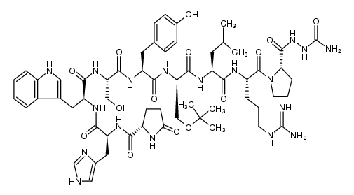 ANTINEOPLASTIC PROSTATE CANCER (THERAPEUTIC) GONADOTROPIN RELEASING HORMONE (GNRH) AGONIST INHIBITS PITUITARY GONADOTROPIN SECRETION | IMPLANTATION | Cmax 2.23 NANOMOLAR VD 20.3 LITER PPB 27.3 PERCENT Cl 9.78 LITER / HOUR HT 1.4 HOUR (EQN) SOLUBILITY SOLUBLE IN WATER | GONADOTROPIN-RELEASING HORMONE RECEPTOR | Gonadotropin-releasing hormone receptor UNIPROT P30968 GNRHR more at DrugCentral | EMA ANSM (in French) Inxight Drugs Dailymed Drugs.com VigiAccess SIDER side effects Chemical Probes Portal ChEMBL BindingDB DrugBank |