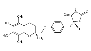 METABOLISM ANTIDIABETIC HYPOGLYCEMIC AGENTS PPAR AGONIST | ORAL | Cmax 6.39 MICROMOLAR (600 MILLIGRAM) VD 1202 LITER (65 KILOGRAM) PPB 99 PERCENT Cl 29.7 LITER / HOUR HT 25 HOUR SOLUBILITY PRATICALLY INSOLUBLE IN WATER | PEROXISOME PROLIFERATOR-ACTIVATED RECEPTOR GAMMA (PPAR) PDB 2VN0 (CYP2C8DH COMPLEXED WITH TROGLITAZONE) LIGAND CODE = TDZ (link to the list of PDB complexes) Download experimental 3D coordinates of TDZ with added hydrogens | Peroxisome proliferator-activated receptor gamma UNIPROT P37231 PPARG more at DrugCentral | EMA ANSM (in French) Inxight Drugs Dailymed Drugs.com VigiAccess SIDER side effects Chemical Probes Portal ChEMBL BindingDB DrugBank |