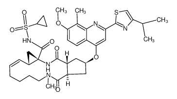 ANTIINFECTIVES HEPATITIS C VIRUS (HCV) NS3/4A PROTEASE INHIBITOR TREATMENT OF CHRONIC HEPATITIS C (CHC) INFECTION A SUBSTRATE OF P-GP | ORAL | Cmax 2.58 MICROMOLAR Tmax 5 HOUR F 62 PERCENT PPB 99.9 PERCENT HT 25.5 HOUR SOLUBILITY PRACTICALLY INSOLUBLE IN WATER | HEPATITIS C VIRUS (HCV) NS3/4A PROTEASE PDB 3KEE (HCV NS3, NS4A COMPLEXED WITH NON-COVALENT MACROCYCLIC COMPOUND TMC435) LIGAND CODE = 30B (link to the list of PDB complexes) Download experimental 3D coordinates of 30B with added hydrogens | Hepatitis C virus serine protease, NS3,NS4A UNIPROT A3EZI9 NS3 -- Genome polyprotein UNIPROT P27958 more at DrugCentral | EMA ANSM (in French) Inxight Drugs Dailymed Drugs.com VigiAccess SIDER side effects Chemical Probes Portal ChEMBL BindingDB DrugBank |