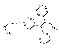 ANTINEOPLASTIC ESTROGEN ANTAGONIST BONE DENSITY CONSERVATION AGENTS OMPETES WITH ESTRADIOL FOR ESTROGEN RECEPTOR | - | Cmax 941 NANOMOLAR HT 336 HOUR | ESTROGEN RECEPTOR PDB 6Z8C (CRYSTAL STRUCTURE OF THE VOLTAGE-GATED SODIUM CHANNEL NAVMS (F208L) IN COMPLEX WITH N-DESMETHYLTAMOXIFEN (3.2 A RESOLUTION)) LIGAND CODE = QBN (link to the list of PDB complexes) Download experimental 3D coordinates of QBN with added hydrogens | Estrogen receptor UNIPROT P03372 ESR1 more at DrugCentral | EMA ANSM (in French) Inxight Drugs Dailymed Drugs.com VigiAccess SIDER side effects Chemical Probes Portal ChEMBL BindingDB DrugBank |