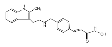 ANTINEOPLASTIC HISTONE DEACETYLASE (HDAC) INHIBITOR TREATMENT OF MULTIPLE MYELOMA | ORAL | Cmax 65 NANOMOLAR Tmax 2 HOUR F 21 PERCENT VD 1000 LITER PPB 90 PERCENT Cl 160 LITER / HOUR HT 37 HOUR SOLUBILITY SLIGHTLY SOLUBLE IN WATER | HISTONE DEACETYLASE PDB 5EF8 (CRYSTAL STRUCTURE OF DANIO RERIO HISTONE DEACETYLASE 6 CATALYTIC DOMAIN 2 IN COMPLEX WITH PANOBINOSTAT) LIGAND CODE = LBH (link to the list of PDB complexes) Download experimental 3D coordinates of LBH with added hydrogens | Histone deacetylase 5 UNIPROT Q9UQL6 HDAC5 -- Histone deacetylase 2 UNIPROT Q92769 HDAC2 more at DrugCentral | EMA ANSM (in French) Inxight Drugs Dailymed Drugs.com VigiAccess SIDER side effects Chemical Probes Portal ChEMBL BindingDB DrugBank |