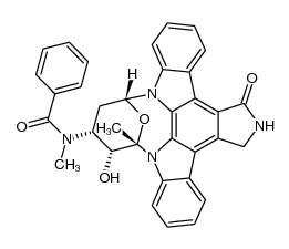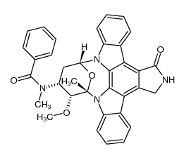 ANTINEOPLASTIC TREATMENT OF ACUTE MYELOID LEUKEMIA (AML) OR AGGRESSIVE SYSTEMIC MASTOCYTOSIS (ASM) MULTIKINASE TYROSINE KINASE INHIBITOR (FLT3, FLT3 MUTANT KINASES (ITD AND TKD), KIT (WILD TYPE AND D816V MUTANT), PDGFR ALPHA/BETA, VEGFR2, AS WELL AS MEMBERS OF THE SERINE/THREONINE KINASE PKC (PROTEIN KINASE C) FAMILY) | ORAL | Tmax 2 HOUR VD 95.2 LITER PPB 99.8 PERCENT HT 21 HOUR | FLT3 KINASE FLT3 MUTANT KINASES KIT PDGFR VEGFR2 SERINE/THREONINE KINASE PKC PDB 4NCT (HUMAN DYRK1A IN COMPLEX WITH PKC412) LIGAND CODE = 2K2 (link to the list of PDB complexes) Download experimental 3D coordinates of 2K2 with added hydrogens | Receptor-type tyrosine-protein kinase FLT3 UNIPROT P36888 FLT3 more at DrugCentral | EMA ANSM (in French) Inxight Drugs Dailymed Drugs.com VigiAccess SIDER side effects Chemical Probes Portal ChEMBL BindingDB DrugBank |