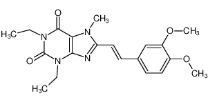NERVOUS SYSTEM ADENOSINE RECEPTOR ANTAGONIST INDICATED AS ADJUNCTIVE TREATMENT TO LEVODOPA/CARBIDOPA IN ADULT PATIENTS WITH PARKINSONS DISEASE (PD) EXPERIENCING OFF EPISODES | ORAL | Tmax 4 HOUR VD 557 LITER PPB 98 PERCENT Cl 4.6 LITER / HOUR HT 83 HOUR SOLUBILITY 0.6 MICROGRAM PER MILLILITER IN WATER | ADENOSINE RECEPTOR A2A PDB 8GNG (CRYSTAL STRUCTURE OF HUMAN ADENOSINE A2A RECEPTOR IN COMPLEX WITH ISTRADEFYLLINE) LIGAND CODE = JQ9 (link to the list of PDB complexes) Download experimental 3D coordinates of JQ9 with added hydrogens | Adenosine receptor A2a UNIPROT P29274 ADORA2A more at DrugCentral | EMA ANSM (in French) Inxight Drugs Dailymed Drugs.com VigiAccess SIDER side effects Chemical Probes Portal ChEMBL BindingDB DrugBank |