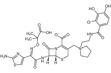 ANTIINFECTIVES CEPHALOSPORIN ANTIBACTERIAL TREATMENT OF COMPLICATED URINARY TRACT INFECTIONS (CUTI) BINDS TO EXTRACELLULAR FREE FERRIC IRON FOR A PASSIVE DIFFUSION VIA PORIN CHANNEL | INTRAVENOUS | Cmax 119.3 MICROMOLAR VD 18 LITER PPB 50 PERCENT Cl 5.18 LITER / HOUR HT 2.5 HOUR | PENICILLIN-BINDING PROTEINS (PBPS) | Peptidoglycan synthase FtsI UNIPROT P0AD68 ftsI -- Penicillin-binding protein 1A UNIPROT Q07806 mrcA more at DrugCentral | EMA ANSM (in French) Inxight Drugs Dailymed Drugs.com VigiAccess SIDER side effects Chemical Probes Portal ChEMBL BindingDB DrugBank |