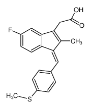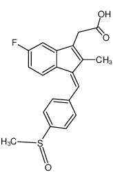 MUSCULO-SKELETAL ANTIINFLAMMATORY NSAID CYCLOOXYGENASE INHIBITORS (EC50 OF 0.02 MICROMOLAR) | - | Tmax 4.96 HOUR PPB 97.9 PERCENT HT 16.4 HOUR | PROSTAGLANDIN G/H SYNTHASE 1 PROSTAGLANDIN G/H SYNTHASE 2 PDB 4XUH (PPARGAMMA LIGAND BINDING DOMAIN IN COMPLEX WITH SULINDAC SULFIDE) LIGAND CODE = SFI (link to the list of PDB complexes) Download experimental 3D coordinates of SFI with added hydrogens | Prostaglandin G,H synthase 2 UNIPROT P35354 PTGS2 more at DrugCentral | EMA ANSM (in French) Inxight Drugs Dailymed Drugs.com VigiAccess SIDER side effects Chemical Probes Portal ChEMBL BindingDB DrugBank |