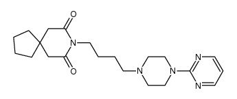 NERVOUS SYSTEM 5HT1A RECEPTOR AGONIST ANXIOLYTIC SEROTONIN AGONISTS | ORAL | Cmax 15.5 NANOMOLAR Tmax 1 HOUR F 90 PERCENT PPB 86 PERCENT HT 2.5 HOUR SOLUBILITY SOLUBLE IN WATER | 5-HYDROXYTRYPTAMINE 1A RECEPTOR PDB 8FYX (BUSPIRONE-BOUND SEROTONIN 1A (5-HT1A) RECEPTOR-GI1 PROTEIN COMPLEX) LIGAND CODE = YLX (link to the list of PDB complexes) Download experimental 3D coordinates of YLX with added hydrogens | 5-hydroxytryptamine receptor 1A UNIPROT P08908 HTR1A more at DrugCentral | EMA ANSM (in French) Inxight Drugs Dailymed Drugs.com VigiAccess SIDER side effects Chemical Probes Portal ChEMBL BindingDB DrugBank |