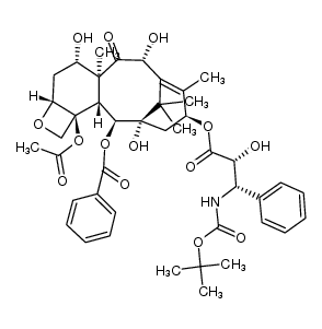 ANTINEOPLASTIC STABILIZES MICROTUBULES | INJECTION INTRAVENOUS | VD 113 LITER PPB 97 PERCENT Cl 33.8 LITER / HOUR HT 11 HOUR SOLUBILITY PRACTICALLY INSOLUBLE IN WATER | TUBULIN PDB 1TUB (TUBULIN ALPHA-BETA DIMER, ELECTRON DIFFRACTION) LIGAND CODE = TXL (link to the list of PDB complexes) Download experimental 3D coordinates of TXL with added hydrogens | Tubulin beta UNIPROT P07437 TUBB more at DrugCentral | EMA ANSM (in French) Inxight Drugs Dailymed Drugs.com VigiAccess SIDER side effects Chemical Probes Portal ChEMBL BindingDB DrugBank |