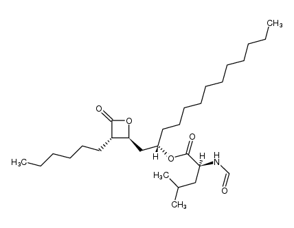 METABOLISM ANTIOBESITY HYPOLIPIDEMIC COVALENT INHIBITOR OF GASTROINTESTINAL LIPASES TREATMENT OF OBESITY | ORAL | Tmax 8 HOUR PPB 99 PERCENT HT 1.5 HOUR SOLUBILITY INSOLUBLE IN WATER | GASTRIC LIPASE PANCREATIC LIPASE | Pancreatic triacylglycerol lipase UNIPROT P16233 PNLIP -- Gastric triacylglycerol lipase UNIPROT P07098 LIPF more at DrugCentral | EMA ANSM (in French) Inxight Drugs Dailymed Drugs.com VigiAccess SIDER side effects Chemical Probes Portal ChEMBL BindingDB DrugBank |
