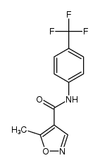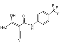 IMMUNOSUPPRESSANTS IMMUNOMODULATIONG AGENT PYRIMIDINE SYNTHESIS INHIBITOR TREATMENT OF PATIENTS WITH RELAPSING FORMS OF MULTIPLE SCLEROSIS ANTIINFLAMMATORY | ORAL | Cmax 233.3 MICROMOLAR Tmax 9 HOUR F 80 PERCENT VD 11 LITER PPB 99 PERCENT Cl 0.0305 LITER / HOUR HT 456 HOUR SOLUBILITY PRACTICALLY INSOLUBLE IN WATER | DIHYDROOROTATE DEHYDROGENASE PDB 1TV5 (PLASMODIUM FALCIPARUM DIHYDROOROTATE DEHYDROGENASE WITH A BOUND INHIBITOR) LIGAND CODE = A26 (link to the list of PDB complexes) Download experimental 3D coordinates of A26 with added hydrogens | Dihydroorotate dehydrogenase (quinone), mitochondrial UNIPROT Q02127 DHODH -- Dihydroorotate dehydrogenase (quinone), mitochondrial UNIPROT Q02127 DHODH more at DrugCentral | EMA ANSM (in French) Inxight Drugs Dailymed Drugs.com VigiAccess SIDER side effects Chemical Probes Portal ChEMBL BindingDB DrugBank |