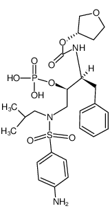 ANTIINFECTIVES ENZYME INHIBITOR (HIV PROTEASE) ANTIVIRAL RAPIDLY AND ALMOST COMPLETELY HYDROLYSED TO AMPRENAVIR | ORAL | SOLUBILITY 0.31 MILLIGRAM / MILLILITER | HIV-1 PROTEASE | Pol polyprotein UNIPROT Q72874 pol more at DrugCentral | EMA ANSM (in French) Inxight Drugs Dailymed Drugs.com VigiAccess SIDER side effects Chemical Probes Portal ChEMBL BindingDB DrugBank |