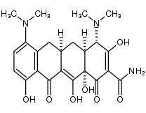 ANTIINFECTIVES ANTIBACTERIAL ANTIBIOTIC TETRACYCLINES | ORAL INJECTION DENTAL TOPICAL | Cmax 9.14 MICROMOLAR (200 MILLIGRAM) VD 104 LITER (65 KILOGRAM) Cl 4.68 LITER / HOUR (65 KILOGRAM) HT 19 HOUR | 30S RIBOSOMAL PROTEIN PDB 4A99 (STRUCTURE OF THE TETRACYCLINE DEGRADING MONOOXYGENASE TETX IN COMPLEX WITH MINOCYCLINE) LIGAND CODE = MIY (link to the list of PDB complexes) Download experimental 3D coordinates of MIY with added hydrogens | Unknown more at DrugCentral | EMA ANSM (in French) Inxight Drugs Dailymed Drugs.com VigiAccess SIDER side effects Chemical Probes Portal ChEMBL BindingDB DrugBank |