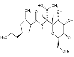 ANTIINFECTIVES ANTIBACTERIAL ANTIBIOTIC PROTEIN SYNTHESIS INHIBITORS A SUBSTANCE PRODUCED BY LINCOLNENSIS GROUP OF STREPTOMYCES LINCOLNENSIS | ORAL INJECTION | Cmax 39 MICROMOLAR (600 MILLIGRAM) VD 65 LITER (65 KILOGRAM) PPB 57 PERCENT Cl 8.2 LITER / HOUR (65 KILOGRAM) HT 5.4 HOUR SOLUBILITY IS FREELY SOLUBLE IN WATER | 50S RIBOSOMAL PROTEIN PDB 5HKV (THE CRYSTAL STRUCTURE OF THE LARGE RIBOSOMAL SUBUNIT OF STAPHYLOCOCCUS AUREUS IN COMPLEX WITH LINCOMYCIN) LIGAND CODE = 3QB (link to the list of PDB complexes) Download experimental 3D coordinates of 3QB with added hydrogens | Unknown more at DrugCentral | EMA ANSM (in French) Inxight Drugs Dailymed Drugs.com VigiAccess SIDER side effects Chemical Probes Portal ChEMBL BindingDB DrugBank |