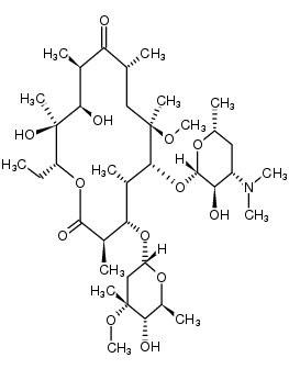 ANTIINFECTIVES ANTIBIOTIC ANTIBACTERIAL MACROLIDES | ORAL | Cmax 5 MICROMOLAR F 50 PERCENT VD 97.5 LITER (65 KILOGRAM) PPB 77 PERCENT Cl 28.5 LITER / HOUR (65 KILOGRAM) HT 6 HOUR SOLUBILITY PRACTICALLY INSOLUBLE IN WATER | 50S RIBOSOMAL PROTEIN PDB 5IGW (MACROLIDE 2'-PHOSPHOTRANSFERASE TYPE II - COMPLEX WITH GDP AND CLARITHROMYCIN) LIGAND CODE = CTY (link to the list of PDB complexes) Download experimental 3D coordinates of CTY with added hydrogens | Unknown more at DrugCentral | EMA ANSM (in French) Inxight Drugs Dailymed Drugs.com VigiAccess SIDER side effects Chemical Probes Portal ChEMBL BindingDB DrugBank |