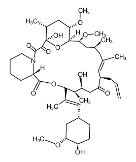 IMMUNOMODULATING AGENT IMMUNOSUPPRESSIVE PHOSPHATASE ACTIVITY OF CALCINEURIN INHIBITED PROTEIN-PROTEIN INHIBITOR (PPI) PROPHYLAXIS OF ORGAN REJECTION MACROLIDE | ORAL INJECTION TOPICAL | Cmax 36.9 NANOMOLAR F 18 PERCENT VD 126.1 LITER (65 KILOGRAM) PPB 99 PERCENT Cl 2.6 LITER / HOUR (65 KILOGRAM) HT 34.8 HOUR SOLUBILITY PRACTICALLY INSOLUBLE IN WATER | FKBP-12 PDB 3O5R (COMPLEX OF FK506 WITH THE FK1 DOMAIN MUTANT A19T OF FKBP51) LIGAND CODE = FK5 (link to the list of PDB complexes) Download experimental 3D coordinates of FK5 with added hydrogens | Peptidyl-prolyl cis-trans isomerase FKBP1A UNIPROT P62942 FKBP1A more at DrugCentral | EMA ANSM (in French) Inxight Drugs Dailymed Drugs.com VigiAccess SIDER side effects Chemical Probes Portal ChEMBL BindingDB DrugBank |
