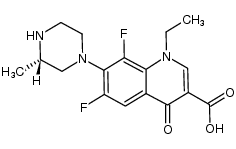ANTIBACTERIAL ANTIINFECTIVE INHIBITOR | ORAL | Cmax 9.1 MICROMOLAR (400 MG) F 97 PERCENT PPB 10 PERCENT Cl 8.7 LITER / HOUR HT 7.75 HOUR SOLUBILITY SLIGHTLY SOLUBLE IN WATER | DNA GYRASE DNA TOPOISOMERASE | DNA gyrase UNIPROT P0AES4 gyrA more at DrugCentral | EMA ANSM (in French) Inxight Drugs Dailymed Drugs.com VigiAccess SIDER side effects Chemical Probes Portal ChEMBL BindingDB DrugBank |
