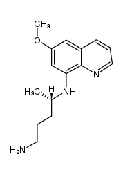 ANTIPARASITIC ANTIMALARIAL ANTIPROTOZOAL AGENTS CAPABLE OF CLEARING THE INTRA-HEPATIC SCHIZONTS AND HYPNOZOITES OF PLASMODIUM VIVAX PRECIPITATE HAEMOLYSIS IN GLUCOSE-6-PHOSPHATE DEHYDROGENASE (G6PD) DEFICIENT INDIVIDUALS GAMETOCYTOCIDAL AGENT IN FALCIPARUM MALARIA INTERFERE WITH THE CELLULAR RESPIRATION OF THE PARASITE BY GENERATING OXYGEN FREE RADICALS AND DEREGULATING THE ELECTRON TRANSPORT | ORAL | Cmax 16 NANOMOLAR (15 MILLIGRAM / DAY , PMID3542534) VD 292 LITER Cl 37.6 LITER / HOUR HT 5.6 HOUR | PDB 4FGJ (OXIDIZED QUINONE REDUCTASE 2 IN COMPLEX WITH PRIMAQUINE) LIGAND CODE = 1PQ (link to the list of PDB complexes) Download experimental 3D coordinates of 1PQ with added hydrogens | Unknown more at DrugCentral | EMA ANSM (in French) Inxight Drugs Dailymed Drugs.com VigiAccess SIDER side effects Chemical Probes Portal ChEMBL BindingDB DrugBank |