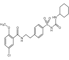 METABOLISM ANTIDIABETIC BLOOD-GLUCOSE-LOWERING DRUG BY STIMULATING THE RELEASE OF INSULIN FROM THE PANCREAS SULFONYLUREA HYPOGLYCEMIC DRUGS | ORAL | VD 5.2 LITER (65 KILOGRAM) PPB 97.9 PERCENT Cl 3.2 LITER / HOUR (65 KILOGRAM) HT 10 HOUR SOLUBILITY AQUEOUS SOLUBILITY INCREASES WITH PH AS A RESULT OF SALT FORMATION | ATP-SENSITIVE POTASSIUM CHANNEL OF THE PANCREATIC B-CELL PDB 5IFU (CRYSTAL STRUCTURE OF PROLYL-TRNA SYNTHETASE (PRORS, PROLINE--TRNA LIGASE) FROM PLASMODIUM FALCIPARUM IN COMPLEX WITH GLYBURIDE) LIGAND CODE = GBM (link to the list of PDB complexes) Download experimental 3D coordinates of GBM with added hydrogens | Sulfonylurea receptor 1, Kir6.2 UNIPROT Q09428 ABCC8 more at DrugCentral | EMA ANSM (in French) Inxight Drugs Dailymed Drugs.com VigiAccess SIDER side effects Chemical Probes Portal ChEMBL BindingDB DrugBank |