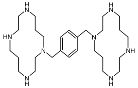 IMMUNOMODULATING IMMUNOSTIMULANTS HEMATOPOIETIC STEM CEL1 MOBILIZER CXCR4 CHEMOKINE RECEPTOR INHIBITOR THAT BLOCKS BINDING OF ITS COGNATE LIGAND: STROMAL CELL-DERIVED FACTOR-LALPHA (SDF-1ALPHA) | SUBCUTANEOUS | VD 19.5 LITER (65 KILOGRAM) PPB 58 PERCENT Cl 3.3 LITER / HOUR (EQN) HT 4 HOUR (0.24 MILLIGRAM / KILOGRAM) | ALPHA-CHEMOKINE RECEPTOR CXCR4 PDB 8U4P (STRUCTURE OF AMD3100-BOUND CXCR4, GI COMPLEX) LIGAND CODE = VH6 (link to the list of PDB complexes) Download experimental 3D coordinates of VH6 with added hydrogens | C-X-C chemokine receptor type 4 UNIPROT P61073 CXCR4 more at DrugCentral | EMA ANSM (in French) Inxight Drugs Dailymed Drugs.com VigiAccess SIDER side effects Chemical Probes Portal ChEMBL BindingDB DrugBank |