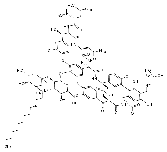 ANTIINFECTIVE LIPOGLYCOPEPTIDE ANTIBACTERIALS SKIN INFECTION GRAM-POSITIVE BACTERIA SYNTHETIC DERIVATIVE OF VANCOMYCIN INHIBITS BACTERIAL CELL WALL SYNTHESIS BY INTERFERING WITH THE POLYMERIZATION AND CROSS-LINKING OF PEPTIDOGLYCAN | INTRAVENOUS INJECTION | Cmax 57.4 MICROMOLAR (10 MILLIGRAM / KILOGRAM) VD 9.4 LITER (65 KILOGRAM) PPB 90 PERCENT Cl 0.9 LITER / HOUR (65 KILOGRAM) HT 8 HOUR SOLUBILITY SLIGHTLY SOLUBLE IN WATER | | Unknown more at DrugCentral | EMA ANSM (in French) Inxight Drugs Dailymed Drugs.com VigiAccess SIDER side effects Chemical Probes Portal ChEMBL BindingDB DrugBank |