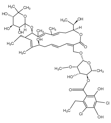 ANTIINFECTIVES MACROLIDE TREATMENT OF CLOSTRIDIUM DIFFICILE-ASSOCIATED DIARRHEA INHIBITOR RNA SYNTHESIS BY RNA POLYMERASES | - | Cmax 12.1 NANOMOLAR (200 MILLIGRAM) Tmax 1.02 HOUR HT 11.2 HOUR | BETA SUBUNIT OF RNA POLYMERASE | DNA-directed RNA polymerase UNIPROT Q182S6 rpoZ more at DrugCentral | EMA ANSM (in French) Inxight Drugs Dailymed Drugs.com VigiAccess SIDER side effects Chemical Probes Portal ChEMBL BindingDB DrugBank |