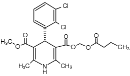 CARDIOVASCULAR VASODILATOR ANTIHYPERTENSIVE DIHYDROPYRIDINE CALCIUM CHANNEL BLOCKER REDUCTION OF BLOOD PRESSURE THE CARBOXYLIC ACID METABOLITE IS INACTIVE AS AN ANTIHYPERTENSIVE | INTRAVENOUS | VD 11 LITER (65 KILOGRAM) PPB 99.5 PERCENT Cl 30.5 LITER / HOUR (EQN) HT 0.25 HOUR SOLUBILITY PRACTICALLY INSOLUBLE IN WATER | L-TYPE CALCIUM CHANNEL BLOCKER | Voltage-dependent L-type calcium channel subunit alpha-1C UNIPROT Q13936 CACNA1C -- Voltage-dependent L-type calcium channel subunit alpha-1D UNIPROT Q01668 CACNA1D more at DrugCentral | EMA ANSM (in French) Inxight Drugs Dailymed Drugs.com VigiAccess SIDER side effects Chemical Probes Portal ChEMBL BindingDB DrugBank |