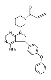 ANTINEOPLASTIC COVALENT KINASE INHIBITOR TREATMENT OF PATIENTS WITH MANTLE CELL LYMPHOMA, CHRONIC LYMPHOCYTIC LEUKEMIA | ORAL | VD 10000 LITER PPB 97.3 PERCENT Cl 1000 LITER / HOUR HT 5 HOUR SOLUBILITY PRACTICALLY INSOLUBLE IN WATER | BRUTON TYROSINE KINASE (BTK) PDB 4IFG (CRYSTAL STRUCTURE OF TGCDPK1 WITH INHIBITOR BOUND) LIGAND CODE = 1E8 (link to the list of PDB complexes) Download experimental 3D coordinates of 1E8 with added hydrogens | Tyrosine-protein kinase BTK UNIPROT Q06187 BTK more at DrugCentral | EMA ANSM (in French) Inxight Drugs Dailymed Drugs.com VigiAccess SIDER side effects Chemical Probes Portal ChEMBL BindingDB DrugBank |