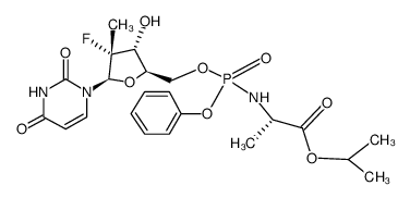 ANTIINFECTIVES TREATMENT OF CHRONIC HEPATITIS C (CHC) INFECTION HEPATITIS C VIRUS (HCV) NUCLEOTIDE ANALOG NS5B POLYMERASE INHIBITOR | ORAL | Tmax 1.25 HOUR PPB 63 PERCENT HT 0.4 HOUR SOLUBILITY SLIGHTLY SOLUBLE IN WATER | HEPATITIS C VIRUS (HCV) NUCLEOTIDE ANALOG NS5B POLYMERASE PDB 8FHS (HUMAN L-TYPE VOLTAGE-GATED CALCIUM CHANNEL CAV1.2 IN THE PRESENCE OF AMIODARONE AND SOFOSBUVIR AT 3.3 ANGSTROM RESOLUTION) LIGAND CODE = WG6 (link to the list of PDB complexes) Download experimental 3D coordinates of WG6 with added hydrogens | NS5B protein UNIPROT Q8JXU8 NS5B -- Genome polyprotein UNIPROT P27958 more at DrugCentral | EMA ANSM (in French) Inxight Drugs Dailymed Drugs.com VigiAccess SIDER side effects Chemical Probes Portal ChEMBL BindingDB DrugBank |