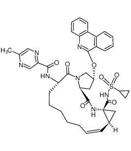 ANTIINFECTIVES TREATMENT OF GENOTYPE 1 CHRONIC HEPATITIS C VIRUS (HCV) HEPATITIS C VIRUS NS3/4A PROTEASE INHIBITOR | ORAL | Cmax 342.4 NANOMOLAR Tmax 4.5 HOUR VD 16.7 LITER PPB 97.8 PERCENT Cl 2.1 LITER / HOUR (EQN) HT 5.5 HOUR SOLUBILITY VERY LOW WATER SOLUBILITY | HCV NS3/4A PROTEASE | Unknown more at DrugCentral | EMA ANSM (in French) Inxight Drugs Dailymed Drugs.com VigiAccess SIDER side effects Chemical Probes Portal ChEMBL BindingDB DrugBank |