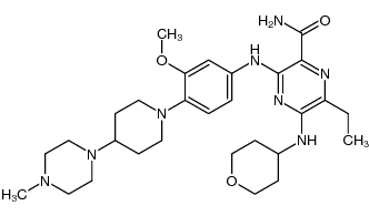 ANTINEOPLASTIC TREATMENT OF ACUTE MYELOID LEUKEMIA (AML) WITH A FLT3 MUTATION TYROSINE KINASES INHIBITOR INHIBITOR OF FMS-LIKE TYROSINE KINASE 3 (FLT3) INCLUDING FLT3-D835Y AND FLT3-ITD-D835Y MUTATIONS | ORAL | Cmax 0.67 MICROMOLAR Tmax 5 HOUR VD 1092 LITER PPB 94 PERCENT Cl 14.85 LITER / HOUR HT 113 HOUR SOLUBILITY SPARINGLY SOLUBLE IN WATER | FMS-LIKE TYROSINE KINASE 3 (FLT3) PDB 6JQR (CRYSTAL STRUCTURE OF FLT3 IN COMPLEX WITH GILTERITINIB) LIGAND CODE = C6F (link to the list of PDB complexes) Download experimental 3D coordinates of C6F with added hydrogens | Receptor-type tyrosine-protein kinase FLT3 UNIPROT P36888 FLT3 more at DrugCentral | EMA ANSM (in French) Inxight Drugs Dailymed Drugs.com VigiAccess SIDER side effects Chemical Probes Portal ChEMBL BindingDB DrugBank |