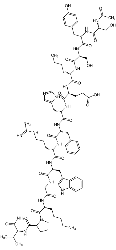 DERMATOLOGICALS MELANOCORTIN 1 RECEPTOR (MC1-R) AGONIST TREATMENT OF PHOTOTOXIC REACTIONS FROM ERYTHROPOIETIC PROTOPORPHYRIA (EPP) A STRUCTURAL ANALOG OF ALPHA-MELANOCYTE STIMULATING HORMONE (ALPHA-MSH) | SUBCUTANEOUS | Cmax 2.2 NANOMOLAR Tmax 36 HOUR HT 15 HOUR SOLUBILITY FREELY SOLUBLE IN WATER | MELANOCORTIN 1 RECEPTOR (MC1-R) | Melanocyte-stimulating hormone receptor UNIPROT Q01726 MC1R more at DrugCentral | EMA ANSM (in French) Inxight Drugs Dailymed Drugs.com VigiAccess SIDER side effects Chemical Probes Portal ChEMBL BindingDB DrugBank |