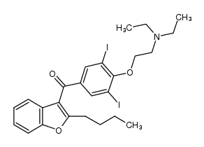 CARDIOVASCULAR ANTIARRHYTHMIC III | ORAL INJECTION | Cmax 40 NANOMOLAR Tmax 5 HOUR F 50 PERCENT VD 3900 LITER (65 KILOGRAM) PPB 96 PERCENT Cl 21.4 LITER / HOUR (65 KILOGRAM) HT 1392 HOUR SOLUBILITY SLIGHTLY SOLUBLE IN WATER | SODIUM CHANNEL POTASSIUM CHANNEL PDB 4O8Z (CRYSTAL STRUCTURE OF HUMAN SIRT3 IN COMPLEX WITH COMPOUND (2-BUTYLBENZOFURAN-3-YL)(4-(2-(DIETHYLAMINO)ETHOXY)-3,5-DIIODOPHENYL)METHANONE) LIGAND CODE = BBI (link to the list of PDB complexes) Download experimental 3D coordinates of BBI with added hydrogens | Potassium voltage-gated channel subfamily H member 2 UNIPROT Q12809 KCNH2 more at DrugCentral | EMA ANSM (in French) Inxight Drugs Dailymed Drugs.com VigiAccess SIDER side effects Chemical Probes Portal ChEMBL BindingDB DrugBank |