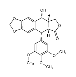 DERMATOLOGICALS ANTIMITOTIC AGENT TREATMENT OF PERIANAL OR MUCOUS MEMBRANE WARTS | TOPICAL | Cmax 41 NANOMOLAR HT 2.7 HOUR SOLUBILITY SPARINGLY SOLUBLE IN WATER | PDB 1SA1 (TUBULIN-PODOPHYLLOTOXIN: STATHMIN-LIKE DOMAIN COMPLEX) LIGAND CODE = POD (link to the list of PDB complexes) Download experimental 3D coordinates of POD with added hydrogens | Unknown more at DrugCentral | EMA ANSM (in French) Inxight Drugs Dailymed Drugs.com VigiAccess SIDER side effects Chemical Probes Portal ChEMBL BindingDB DrugBank |