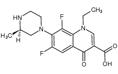 ANTIBACTERIAL ANTIINFECTIVE INHIBITOR | ORAL | Cmax 9.1 MICROMOLAR (400 MG) F 97 PERCENT PPB 10 PERCENT Cl 8.7 LITER / HOUR HT 7.75 HOUR SOLUBILITY SLIGHTLY SOLUBLE IN WATER | DNA GYRASE DNA TOPOISOMERASE | DNA gyrase UNIPROT P0AES4 gyrA more at DrugCentral | EMA ANSM (in French) Inxight Drugs Dailymed Drugs.com VigiAccess SIDER side effects Chemical Probes Portal ChEMBL BindingDB DrugBank |