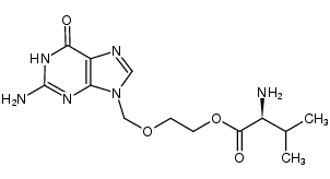 ANTIINFECTIVES ANTIVIRAL AGAINST HERPES SIMPLEX VIRUS TYPES 1 (HSV-1), TYPES 2 (HSV-2) AND VARICELLA-ZOSTER VIRUS (VZV) | ORAL | Cmax 17.4 MICROMOLAR F 54 PERCENT PPB 15.7 PERCENT SOLUBILITY 174 MILLIGRAM / MILLILITER IN WATER | DNA POLYMERASE PDB 4AQL (HUMAN GUANINE DEAMINASE IN COMPLEX WITH VALACYCLOVIR) LIGAND CODE = TXC (link to the list of PDB complexes) Download experimental 3D coordinates of TXC with added hydrogens | DNA polymerase catalytic subunit UNIPROT P04293 more at DrugCentral | EMA ANSM (in French) Inxight Drugs Dailymed Drugs.com VigiAccess SIDER side effects Chemical Probes Portal ChEMBL BindingDB DrugBank |