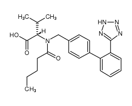 CARDIOVASCULAR ANTIHYPERTENSIVE ANGIOTENSIN II ANTAGONIST | ORAL | Tmax 3 HOUR F 25 PERCENT VD 17 LITER PPB 95 PERCENT Cl 2 LITER / HOUR HT 6 HOUR SOLUBILITY SLIGHTLY SOLUBLE IN WATER | TYPE-1 ANGIOTENSIN II RECEPTOR PDB 8DQT (HUMAN PDK1 KINASE DOMAIN IN COMPLEX WITH VALSARTAN) LIGAND CODE = U35 (link to the list of PDB complexes) Download experimental 3D coordinates of U35 with added hydrogens | Type-1 angiotensin II receptor UNIPROT P30556 AGTR1 more at DrugCentral | EMA ANSM (in French) Inxight Drugs Dailymed Drugs.com VigiAccess SIDER side effects Chemical Probes Portal ChEMBL BindingDB DrugBank |