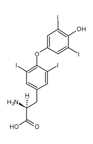HORMONES THYROMIMETIC ANTICOAGULANTS SYNTHETIC L-THYROXINE T4 ANTITHYROID AGENTS HYPOTHYROIDISM | ORAL INTRAVENOUS | F 94 PERCENT PPB 99 PERCENT HT 156 HOUR | THYROID HORMONE RECEPTOR PDB 4X30 (CRYSTAL STRUCTURE OF HUMAN THYROXINE-BINDING GLOBULIN COMPLEXED WITH THYROINE AT 1.55 ANGSTROM RESOLUTION) LIGAND CODE = T44_4X30 (link to the list of PDB complexes) Download experimental 3D coordinates of T44_4X30 with added hydrogens | Thyroid hormone receptor alpha UNIPROT P10827 THRA -- Thyroid hormone receptor beta UNIPROT P10828 THRB more at DrugCentral | EMA ANSM (in French) Inxight Drugs Dailymed Drugs.com VigiAccess SIDER side effects Chemical Probes Portal ChEMBL BindingDB DrugBank |